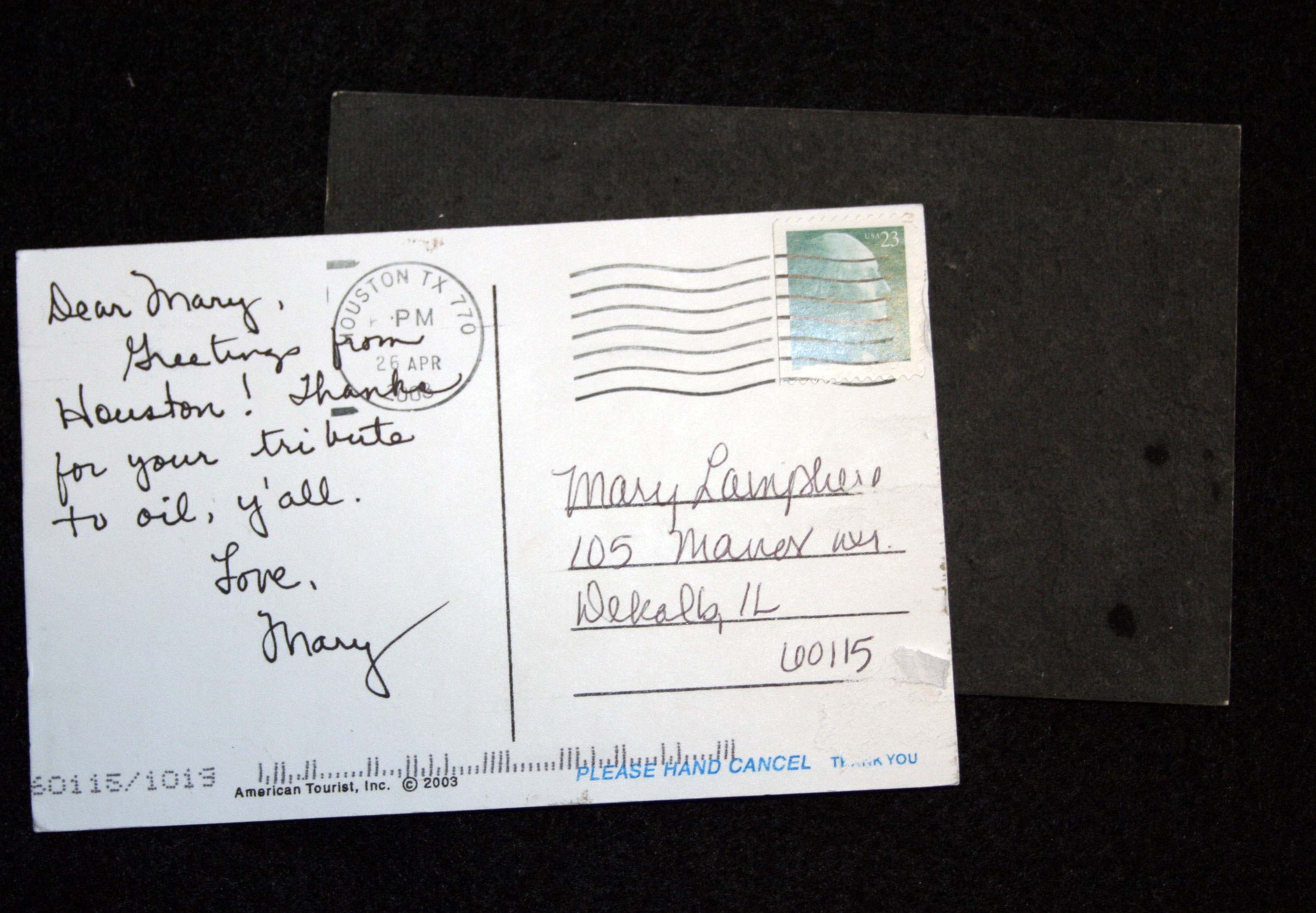 For the cards that I did not have personal addresses for, I looked up post offices on the internet. I wrote a very considerate letter, Dear Friendly Postal Service Provider, included my reason and request, pre-posted and addressed a specific card, and tucked it all neatly into a standard sized envelope. Of the ten cards I sent out, I got six back. Six and a story.