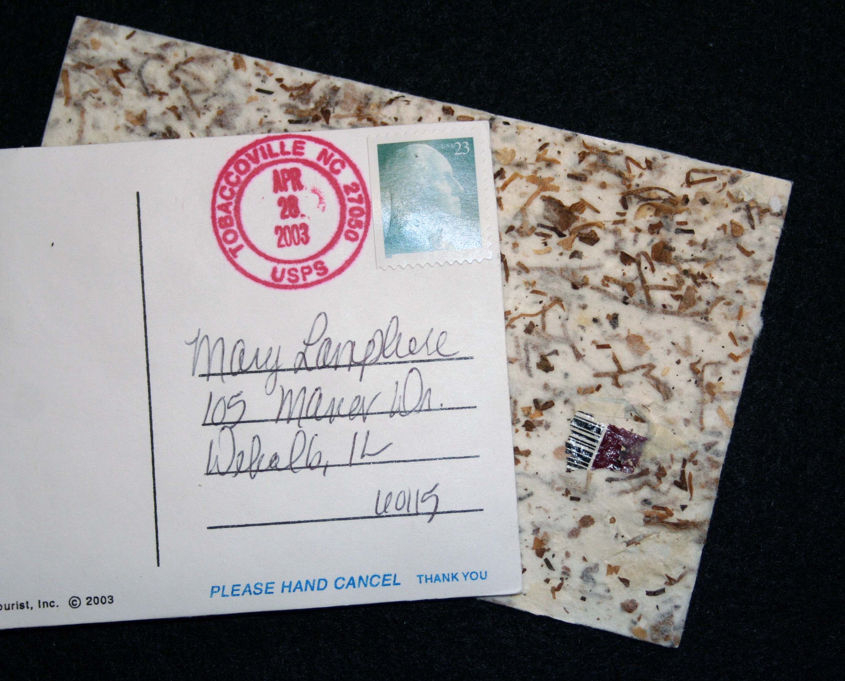 For the final assignment in my paper-making class, I had decided to pull papers with inclusions and make post cards out of them. I wanted the inclusions to represent specific destinations in the US. I shredded playing cards for Las Vegas, added tobacco for North Carolina, sand for California, oil for Texas, etc. Originally I was just going to print on them, Greetings From…, but then during critique someone suggested I send them to these places and have them post-marked. I loved the idea. I am a sucker for the USPS, and I have friends and family in several of my “greetings from…” locales.