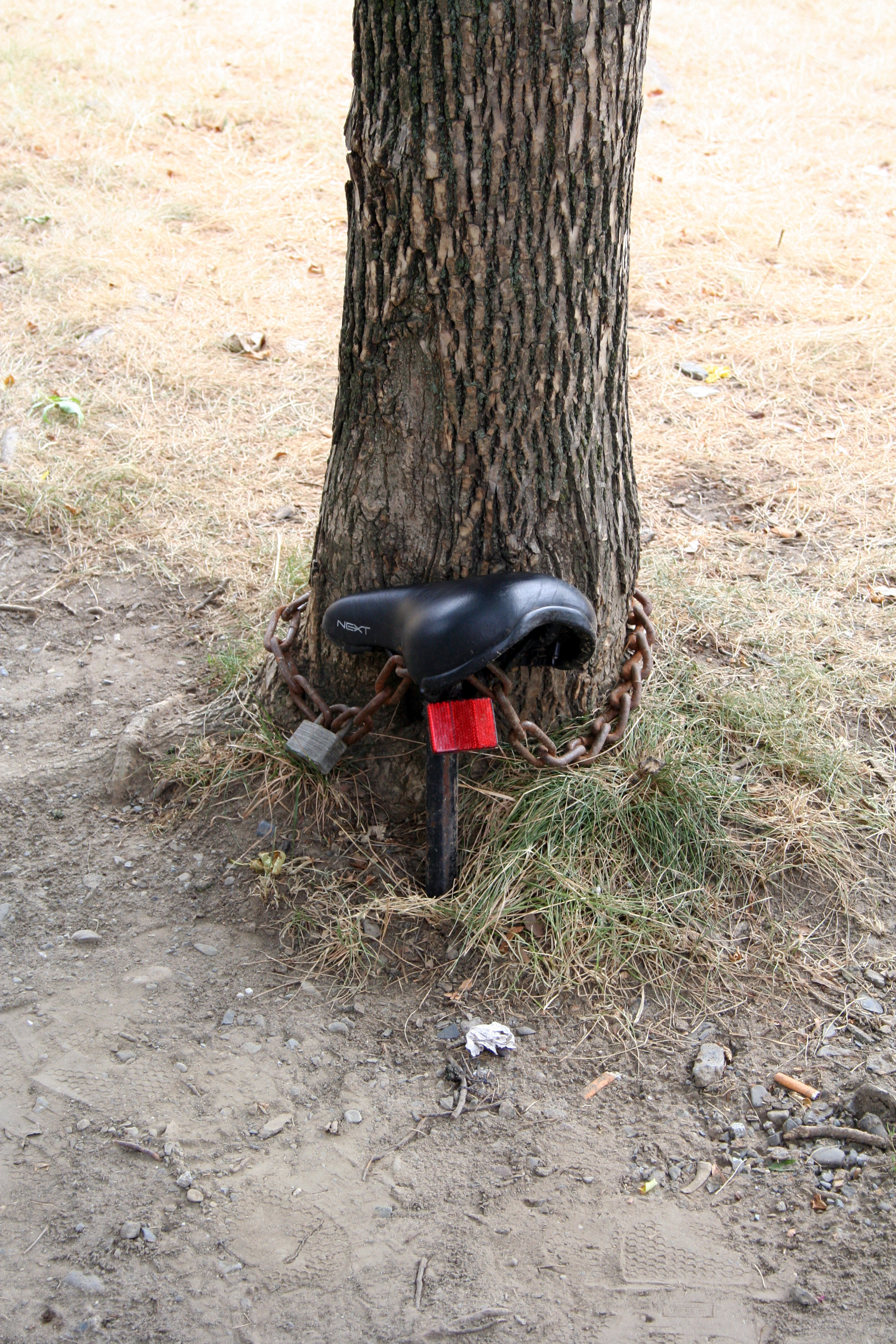 * I often take photos of bicycles. Some of the inner city bikes have quite a personality, tell quite a story. This was the first time I’ve taken a picture of just a seat. A seat chained to a tree. That had to be an uncomfortable ride home! And kind of weird.