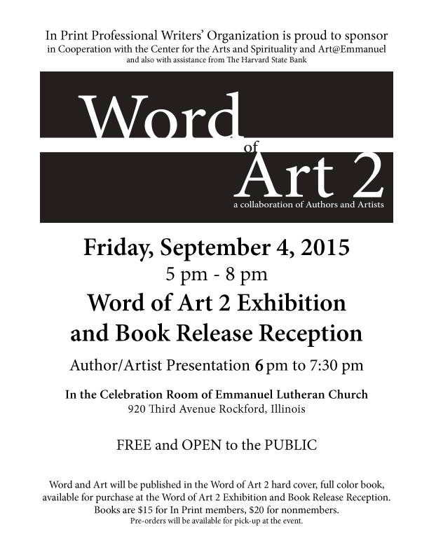 Word of Art 2 books cost $15 for In Print members and $20 for nonmembers. You may pre-order a book with cash or check made out to In Print or through Paypal for an additional dollar fee. Paypal orders do NOT include shipping. Books will be available for pick up and purchase at the Word of Art 2 Exhibition and Book Release Reception to be held Friday, September 4, 2015 from 5 pm to 8 pm at the Emmanuel Lutheran Church Gallery, 920 Third Avenue, Rockford, IL 61104. The reception will feature an Author/Artist program from 6 pm to 7:30 pm.