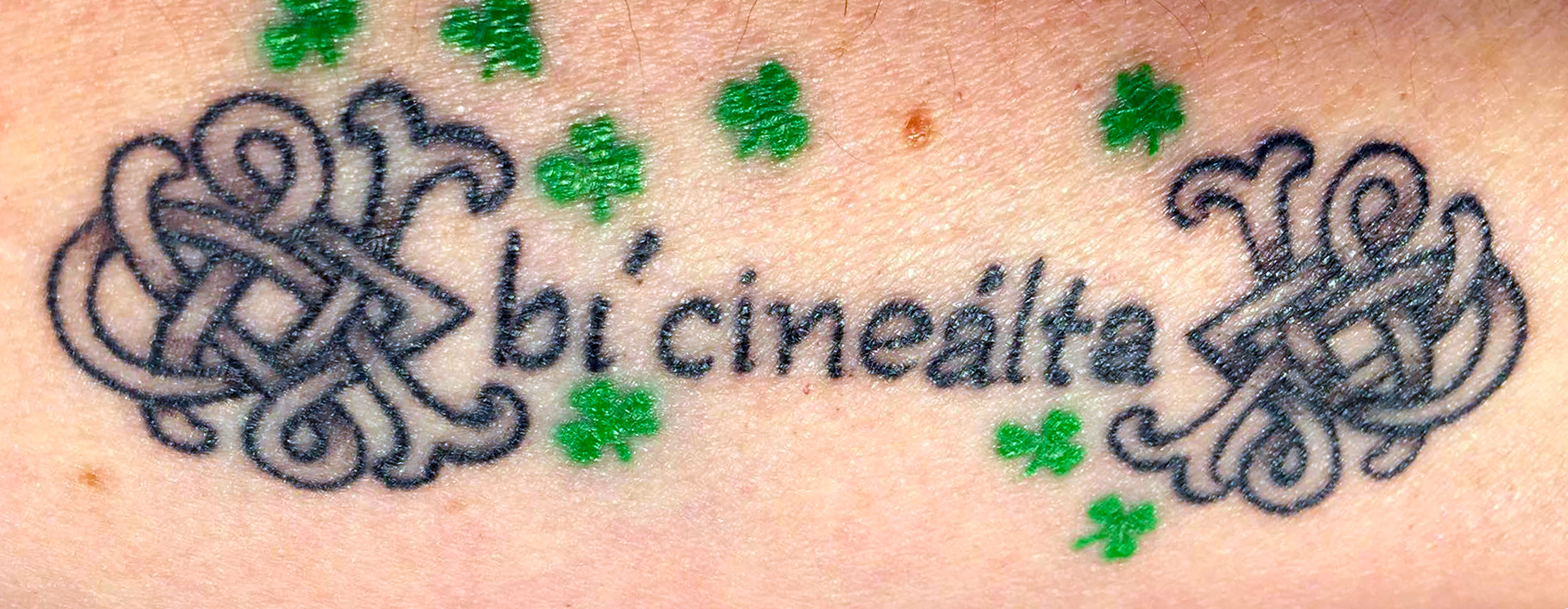 On her inner left forearm, are two words, bí cineálta. They are capped on each end by Celtic knots and sprinkled with shamrocks that represent her closest family.