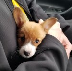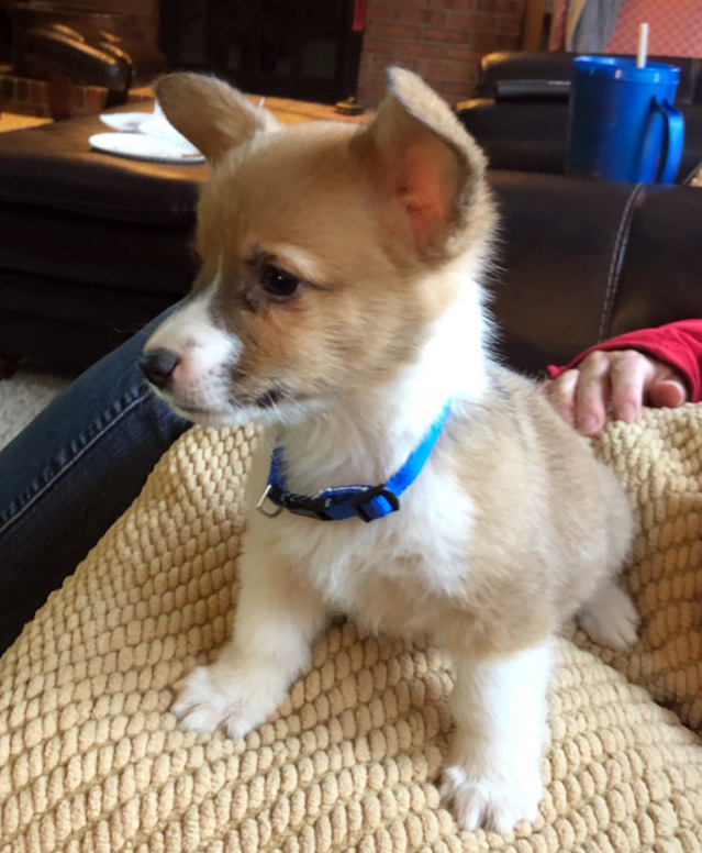He’s a red and white Pembroke Welsh Corgi—ย big ears, short legs, no tail.