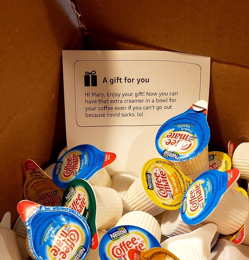 Hi Mary, Enjoy your gift! Now you can have that extra creamer in a bowl for your coffee even if you can’t go out because covid sucks! lol