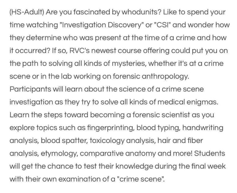 Every Tuesday for four weeks, my friends and I met for an early dinner before heading to RVC for fun and learning. At capacity with 20 students, this was the first time the class had been offered to adults. The teacher, Laura Constant, has taught this for kids as a STEM class. She said she had a lot of parents who were interested in learning about forensics, too, so she pitched the idea.