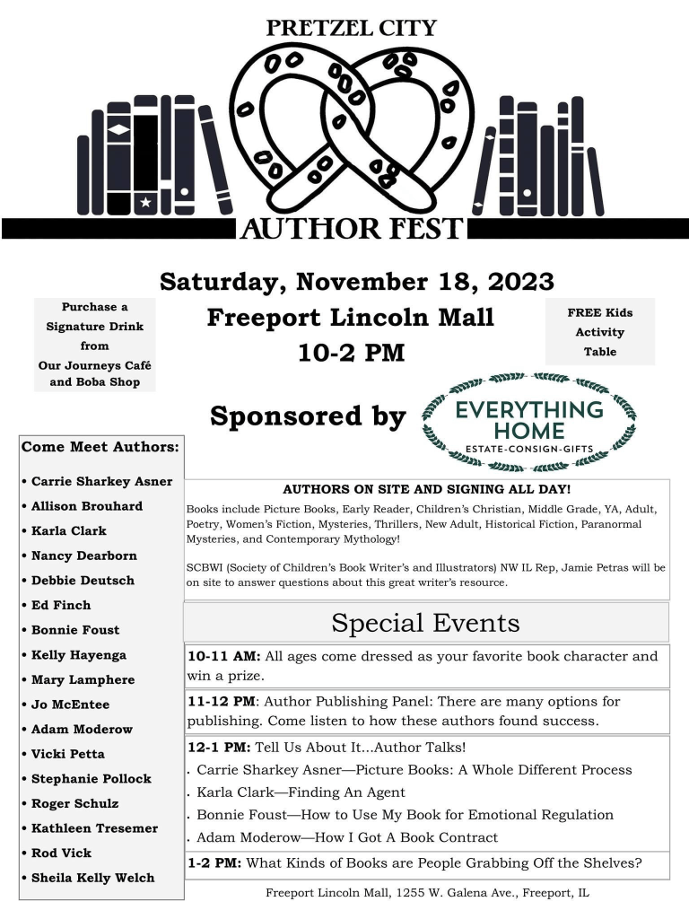 On the heels of this successful release party is the Pretzel City Author Fest, put together by author Debbie Winnekins Deutsch and sponsored by Everything Home. The event is this coming Saturday, November 18, from 10 am to 2 pm at the Lincoln Mall in Freeport, Illinois. In addition to the mall offerings*, the fest features a variety of local authors, guest speakers, and panel discussions. I will be there selling and signing my books. I hope you are able to attend! I have no doubt that being around so many accomplished authors and eager readers will inspire me further.