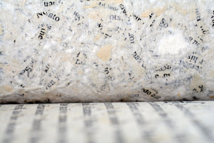 The Why: A Parable, hand pulled paper using psychology text book and bible pages, carbon transferred text, Japanese stab binding