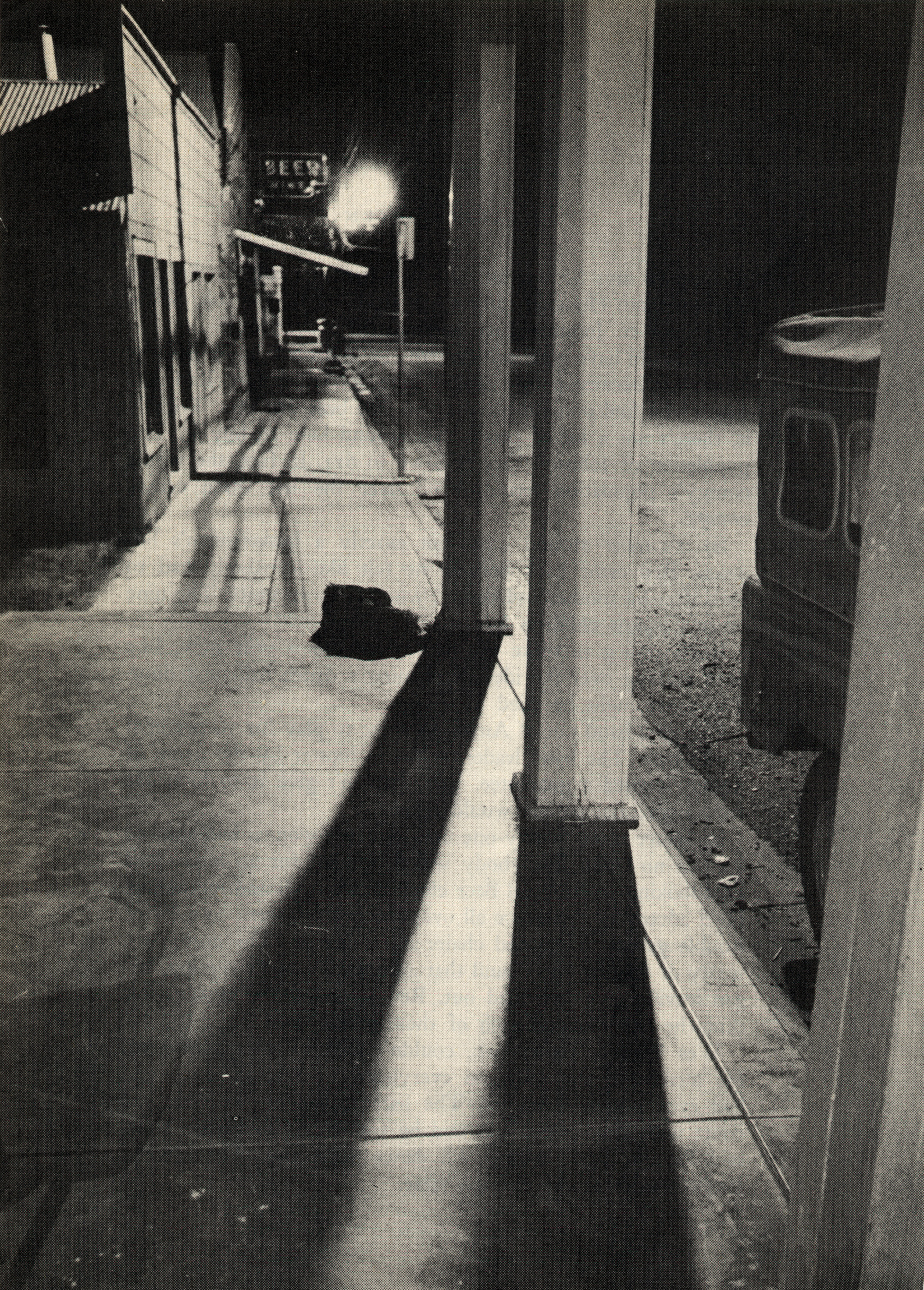 They stood in silence, struck by shadows falling from the posts supporting the overhang. Desolate sidewalk behind them, promise of light ahead, mysterious feel-bad in between. In unison they wished someone would emerge from the corner bar. A stumbling drunk, a third-shifter heading to work, the owner closing up for the night. Someone, anyone.